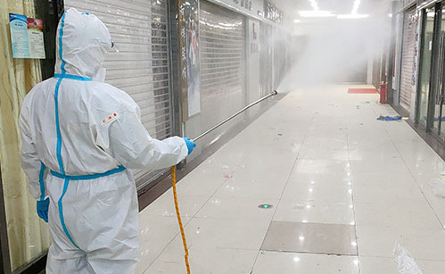 噴霧技術:掛流狀態; 1、橫向噴灑幅度為75 cm; 2、左右幅度間應有5 cm的重疊; 3、自上向下噴灑; 4、首先自上向下噴灑,結束一個噴灌噴 灑幅度 后,順時針橫移,開始下一個幅度噴灑; 5、保持噴嘴距離墻面45 cm; 6、開始噴灑時首先向前傾斜,當噴嘴向下噴灑時,身體向后傾斜; 7、自時口順時針操作,直至房間處理完畢; 8、對人體接觸較多的柜臺、桌椅、門把手、水龍頭等可用0.2%-0.5%過氧乙酸溶液或有效氯為500mg/L-1000mg/L的二氧化氯消毒劑進行噴灑或擦拭消毒,作用時間15-30分鐘。